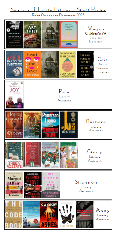 Every quarter, Saxton B. Little Library staff name their favorite books of the last three months. We display a poster of everyone’s choices by the New Books section at the Library – and now you can access the list online!
