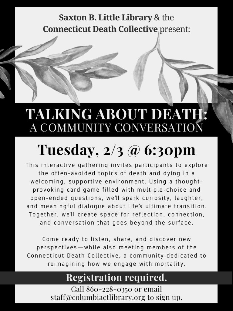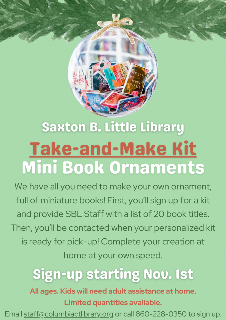 Please stop in, call the Library at 860-228-0350, or email Cait at corlomoski@columbiactlibrary.org to register for any of these programs.
