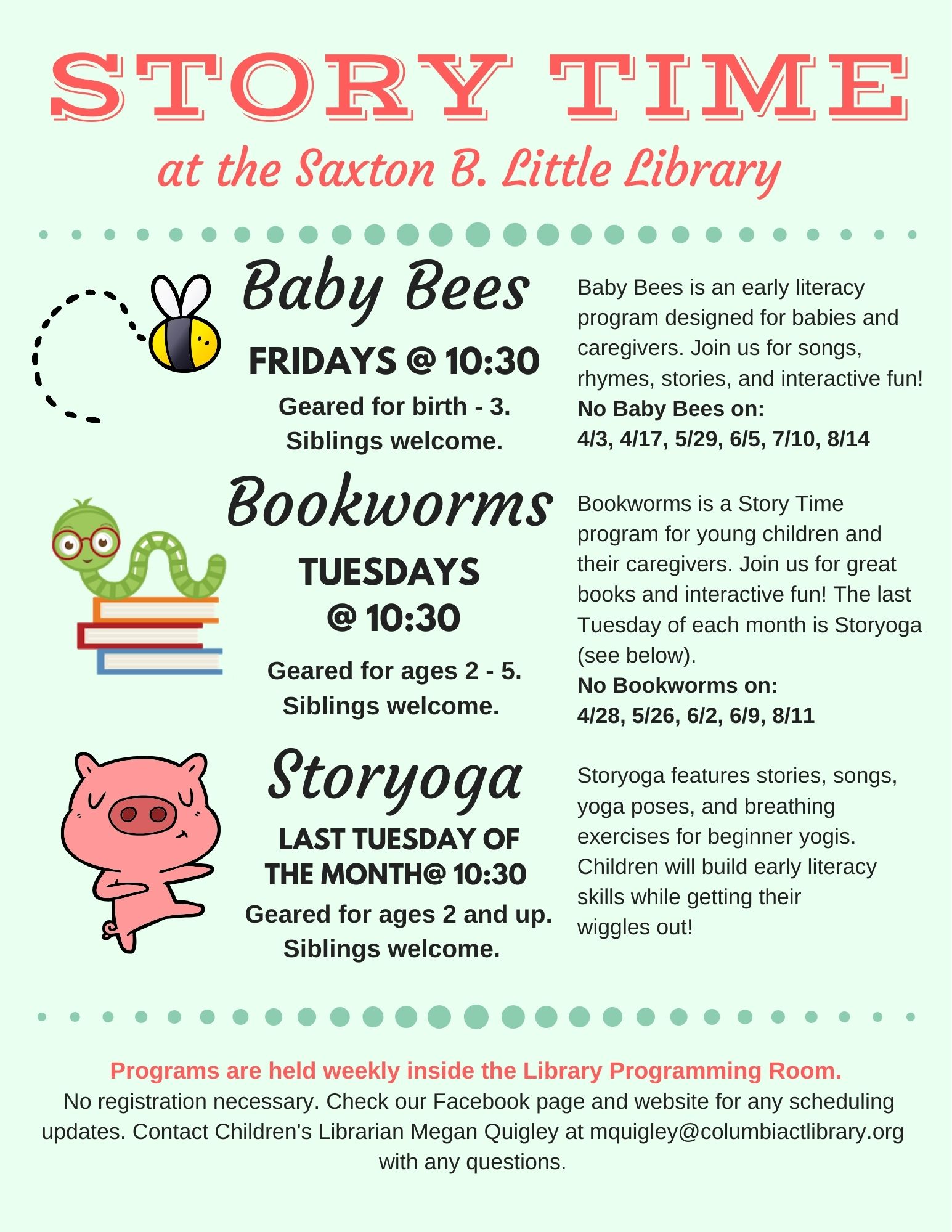 No Story Time on 4/28, 5/26, 6/2, 6/9, 8/11